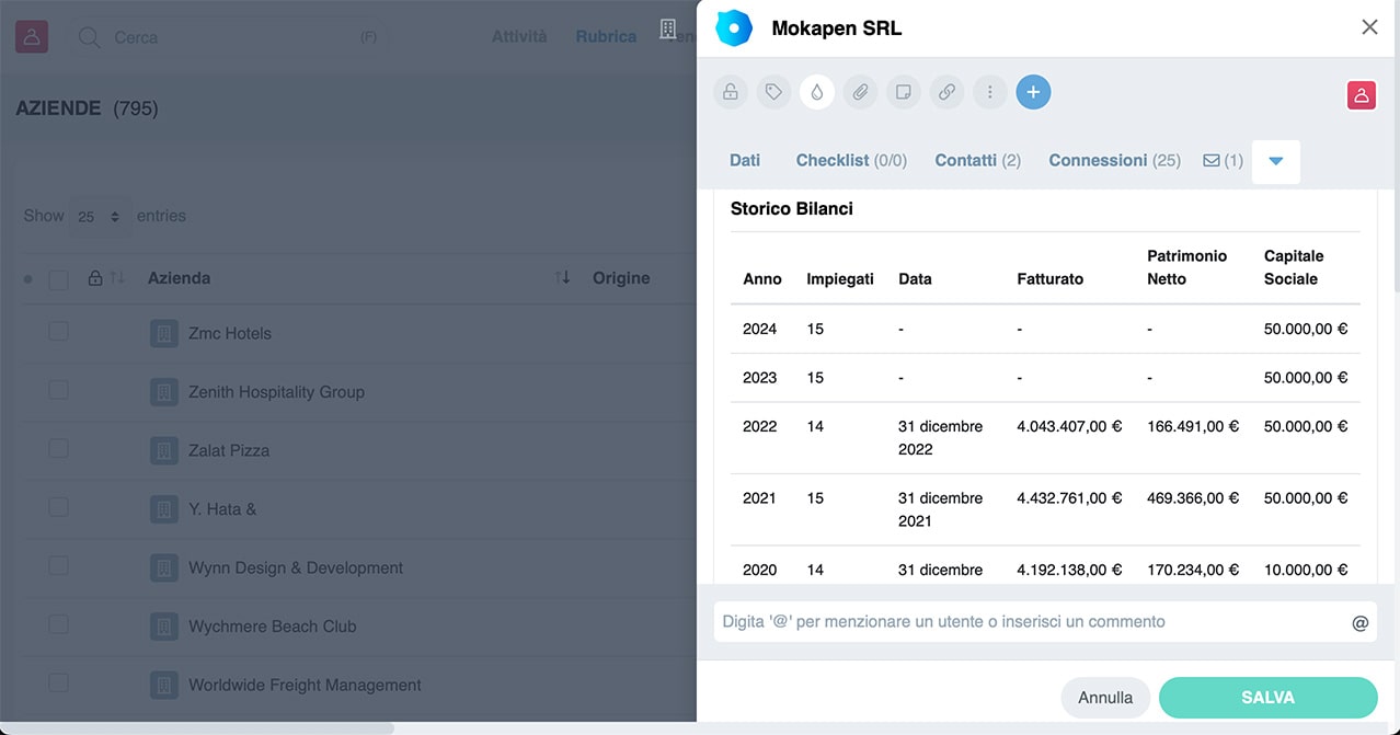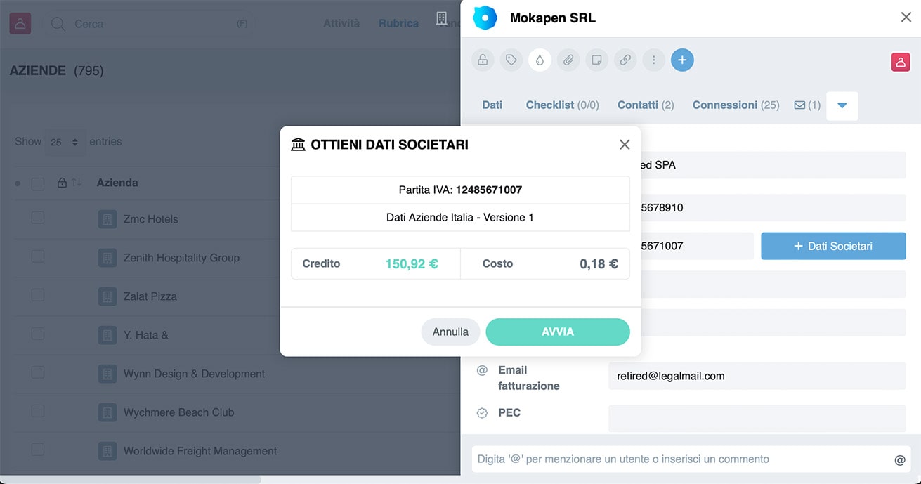 Sincronizza le aziende della tua rubrica a diverse fonti ufficiali per avere dati societari in base alla Partita IVA.